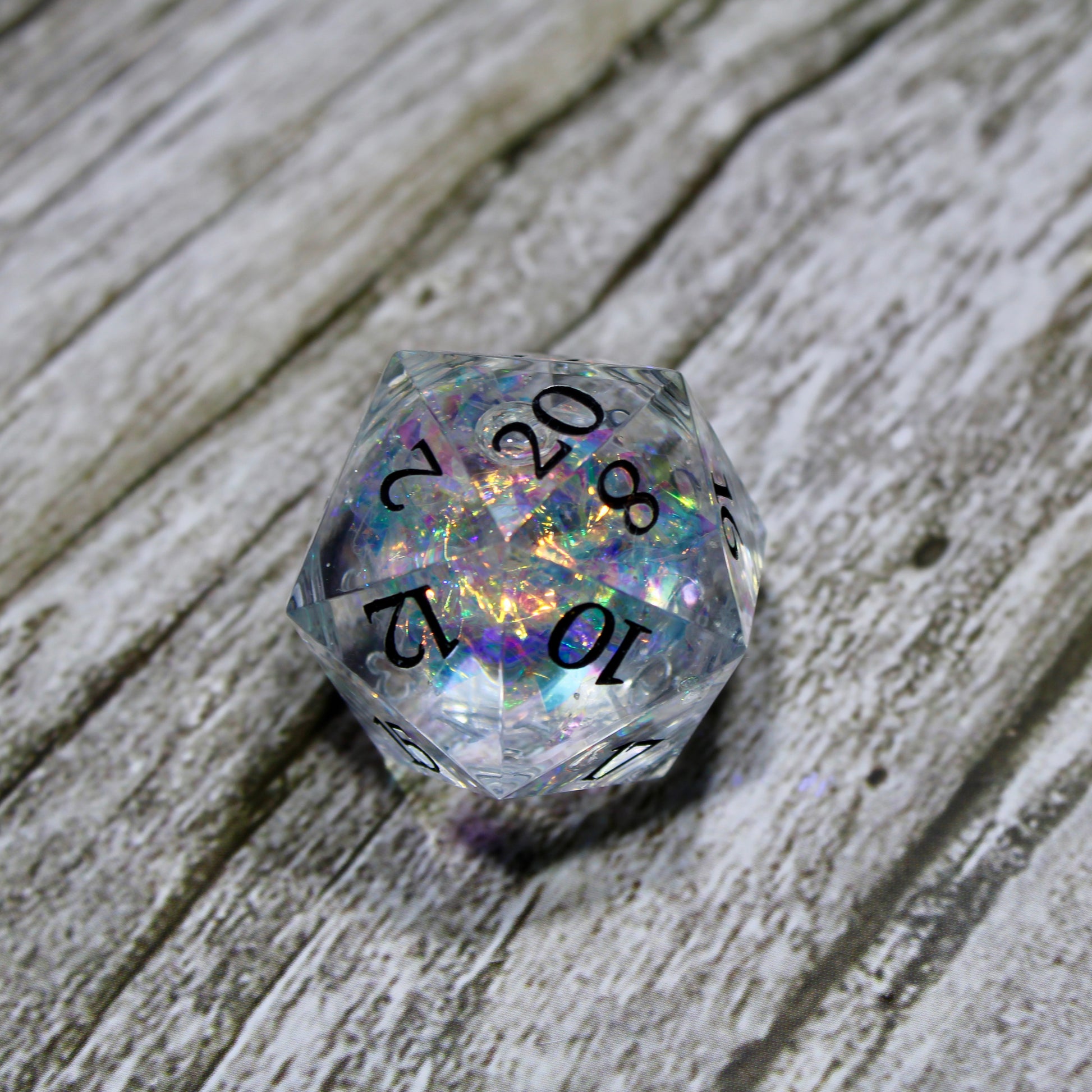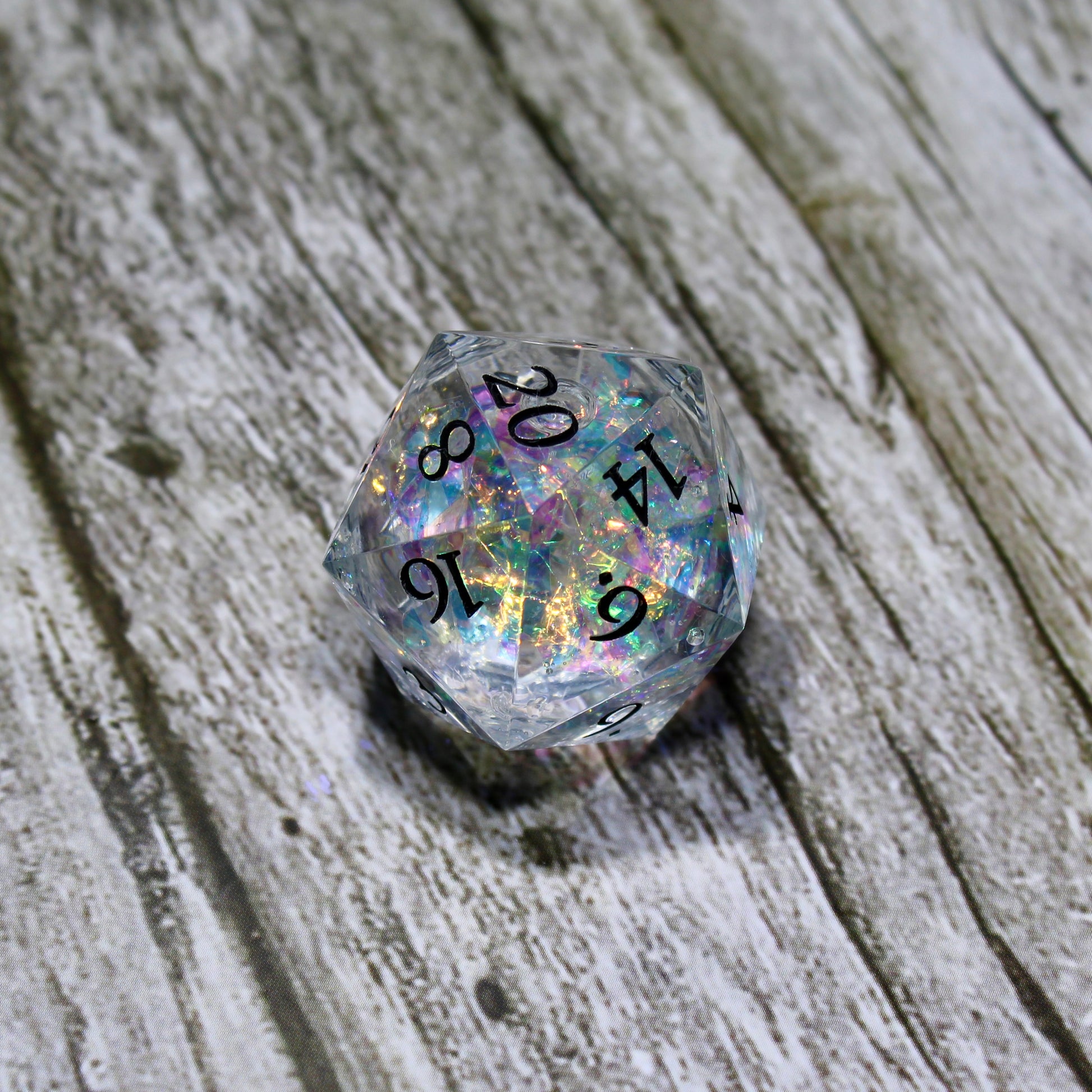 Hand made resin sharp edge D20 (30mm). DUE TO EACH DICE BEING UNIQUELY MADE THEY MAY DIFFERENTIATE FROM IMAGE, NO DICE SET CAN BE POURED IDENTICAL EACH TIME.