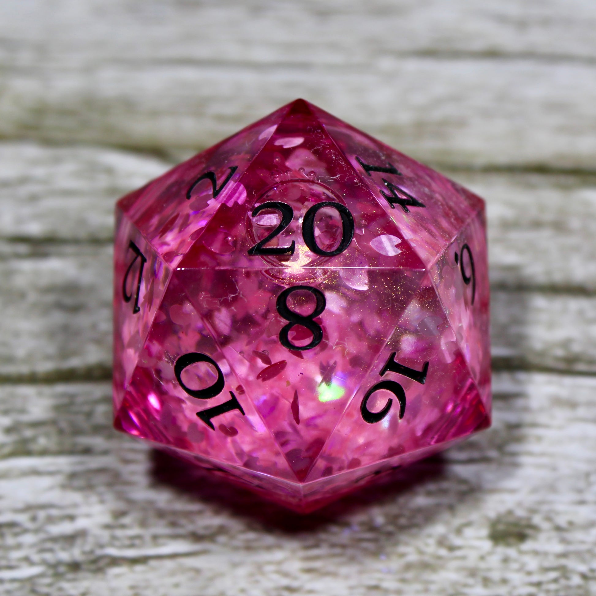 Hand made resin sharp edge D20 (30mm). DUE TO EACH DICE BEING UNIQUELY MADE THEY MAY DIFFERENTIATE FROM IMAGE, NO DICE SET CAN BE POURED IDENTICAL EACH TIME.