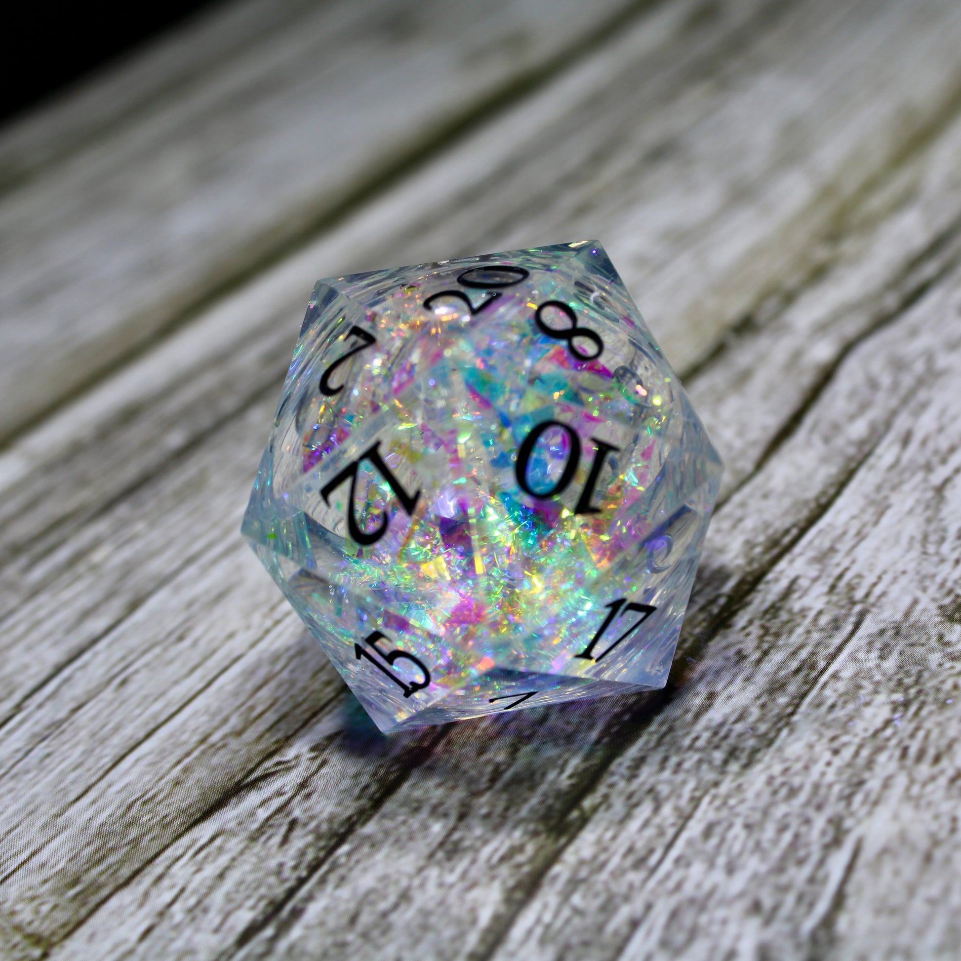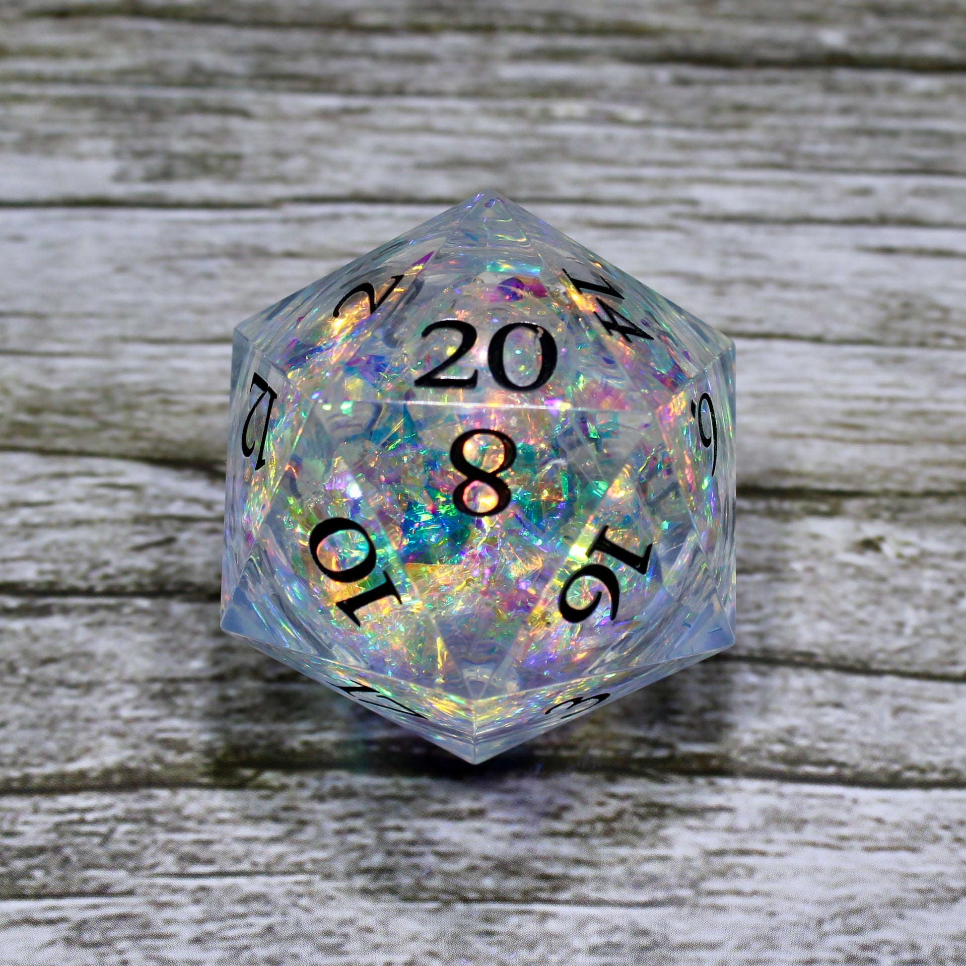 Hand made resin sharp edge D20 (30mm). DUE TO EACH DICE BEING UNIQUELY MADE THEY MAY DIFFERENTIATE FROM IMAGE, NO DICE SET CAN BE POURED IDENTICAL EACH TIME.